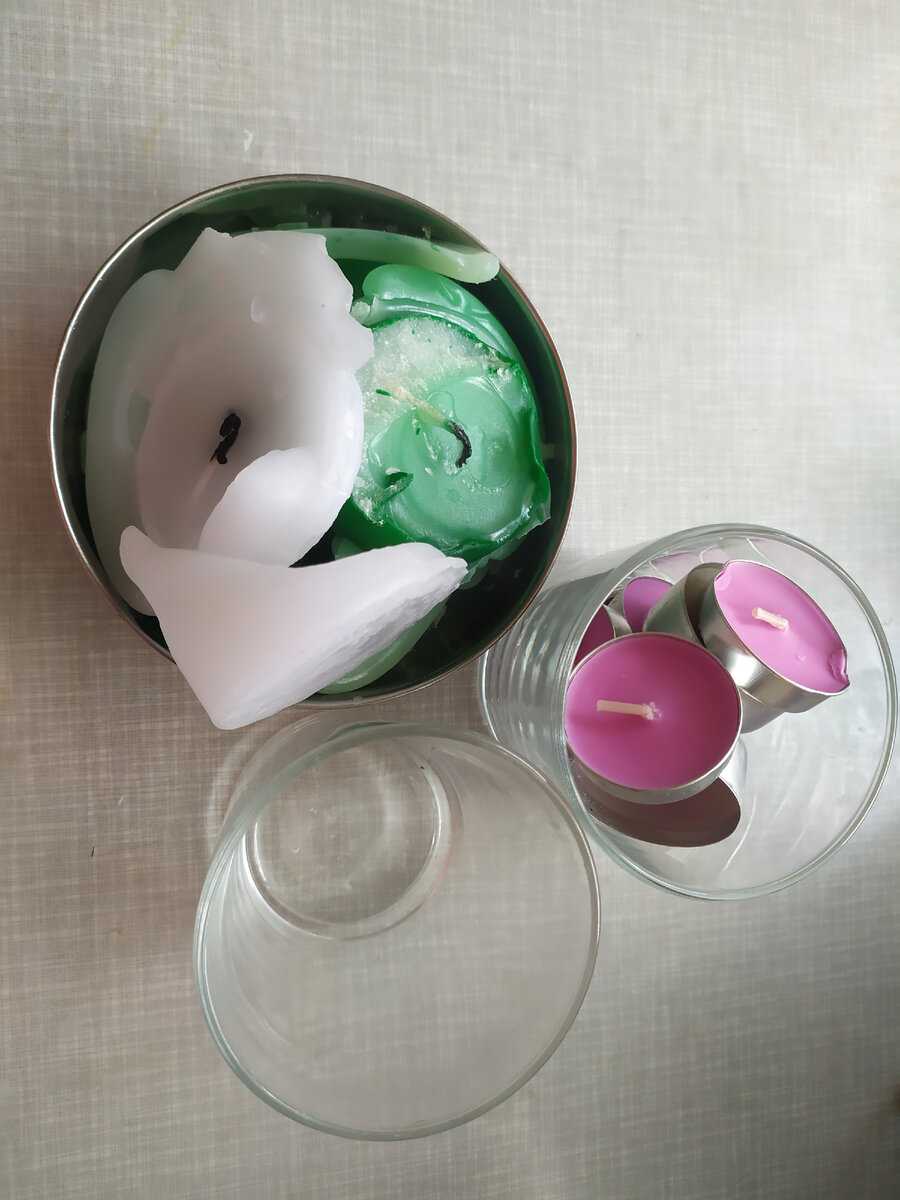 Жила-была девочка Оля и любила она свечки жечь. Часто от них оставалось много воско-парафина и она их выбрасывала. Но посмотрела цены на новые свечи и жалко стало... Дано: остатки от 2х белых свечей, остатки от 2х зеленых свечей и мелкие скорострелы розовые. Ну и пара стаканов от старых свечей. Взяла я жестяные банки от горошка, благо брат их собирает и в металлолом увозит у работы. Поделила примерно пополам воск оставшийся. Тут надо фитили и железки убрать не забыть и помельче покрошить, чтобы плавилось скорее От вышивки у меня оставалось мулине, из него скпутила жгутики и промазала воском, чтобы форму держали К спицам закрепила фитили будущие и забросила на стаканы А в это время согрела воду горячую и закинула туда баночки с воском. И полные баночки стали раза в 2 меньше🤯 Потом достала баночки поочерёдно и залила в стаканы. Без полотенчика не обошлось, конечно 🙃 Оставила на ночь свечи остывать-затвердевать. Они горячие яркие, остывать стали белые и я думала совсем цвет потер