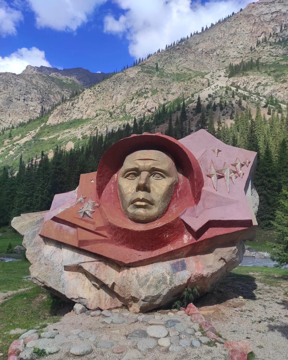 День 4. Из ущелья Джеты-Огуз до каньона Сказка дорога дорога идет близко к озеру Иссык-Куль и где то по середине есть поворот в ущелье Барскоон. Это одно из красивейших ущелий на южном берегу Иссык-Куля, знаменитое своими высокими водопадами и густыми еловыми лесами. Именно здесь находится самый большой золотоносный рудник Кыргызстана — «Кумтор». Времени в обрез, посетить знаменитые водопады ущелья, которых здесь аж четыре (Слезы барса, Чаша Манаса, Брызги шампанского и Борода Ак-Сакала), совсем нет. Что ж, решаем доехать до памятников Юрию Гагарину, которых здесь сразу два. Позже прочитали историю их появления. Когда первый космонавт в 1964 году отдыхал в военном санатории в Тамге, на побережье Иссык-Куля, он приехал в это ущелье на прогулку. Его фотографировали на фоне природы, и его внимание привлек огромный валун. Он стоял перед ним несколько минут, гладил его. Потом кортеж двинулся дальше, а позже местный скульптор, работавший в санатории оформителем, высек на том камне профиль г