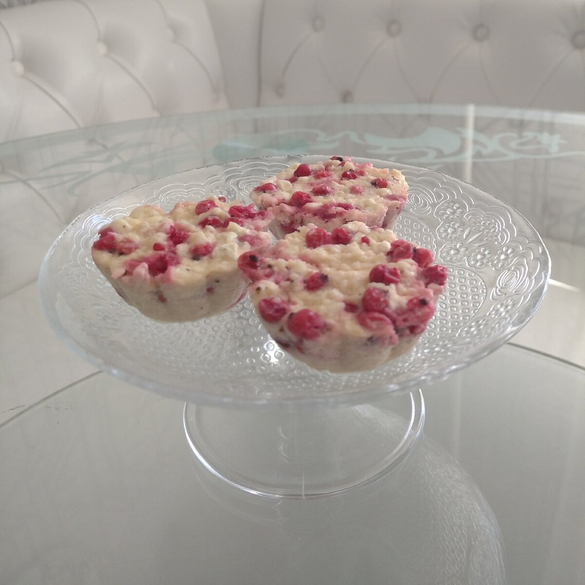 смородина - 70 г Приготовление: Соединяем все ингредиенты и тщательно перемешиваем (ягоды добавляйте в последнюю очередь, чтобы не помять их). Накладываем в силиконовые формочки по 56 г, оправляем в микроволновку на 6 минут при максимальной мощности (у меня 800),(включаем три раза по 2 минуты) и получаем 6 вкусных вареников. КБЖУ на 100г: 139,2/12,5/7,2/5. Можно есть их со сметаной или йогуртом.