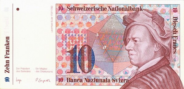 Так, на знаке в 10 франков (посвящённом Леонарду Эйлеру) поместили изображение многогранника и схему задачи о мостах Кёнигсберга. На обороте – уравнение гамма-функции, таблица для расчёта чисел и схема Солнечной системы.