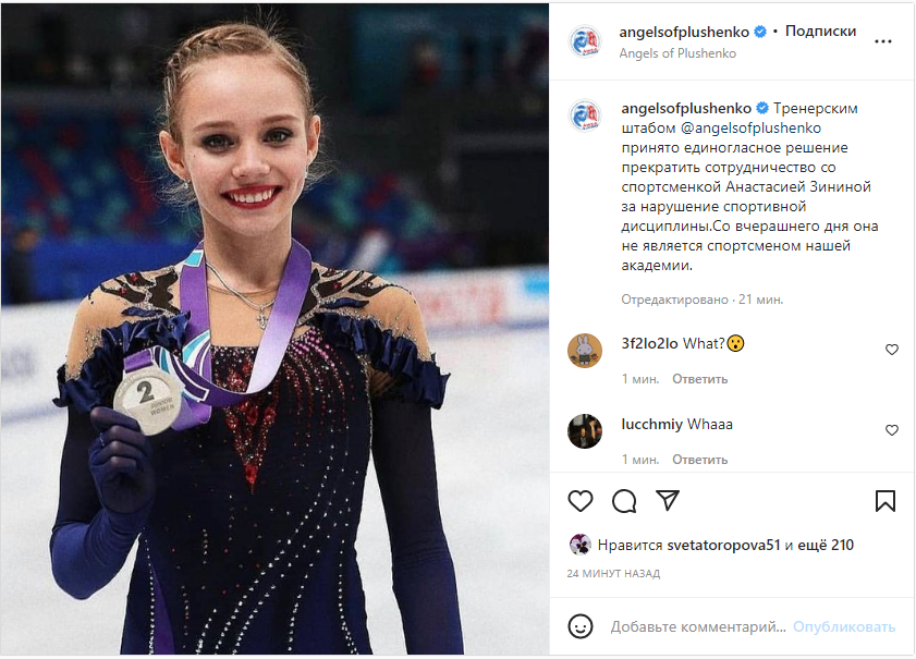 И что скажете? Как по мне приключился какой-то скандал. Вообще прощание не в духе Ангелов. Впевые вижу такой категоричный пост от них. Причем, с указанием единогласного решения всех тренеров. Пока не знаю, что случилось. Программы уже поставлены, работа шла полным ходом. Кто что слышал? #евгенийплющенко #ангелыплющенко #зининанастя