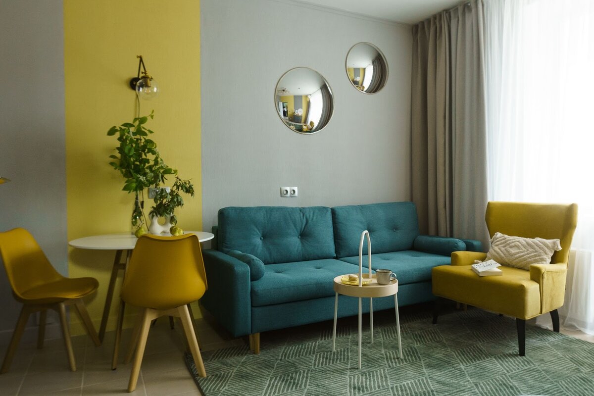 Комнату «разбили» на цветовые блоки 2-х или 3 оттенков, таким образом мы сделали пространства не только визуально больше, но и внесли нотки индивидуальности и стиля. Также с помощью приема Color blocking мы зонировали кухню и гостиную. Конечно, важно оставаться в пределах 2-х, 3-х оттенков во всей квартире. Вертикальные цветовые полоски также визуально вытянули стены, сделали потолок выше.