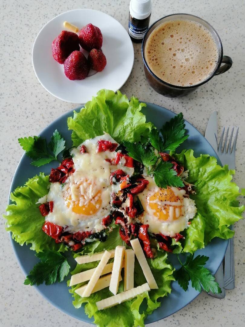 Яичница с вялеными томатами, шпинатом и пармезаном