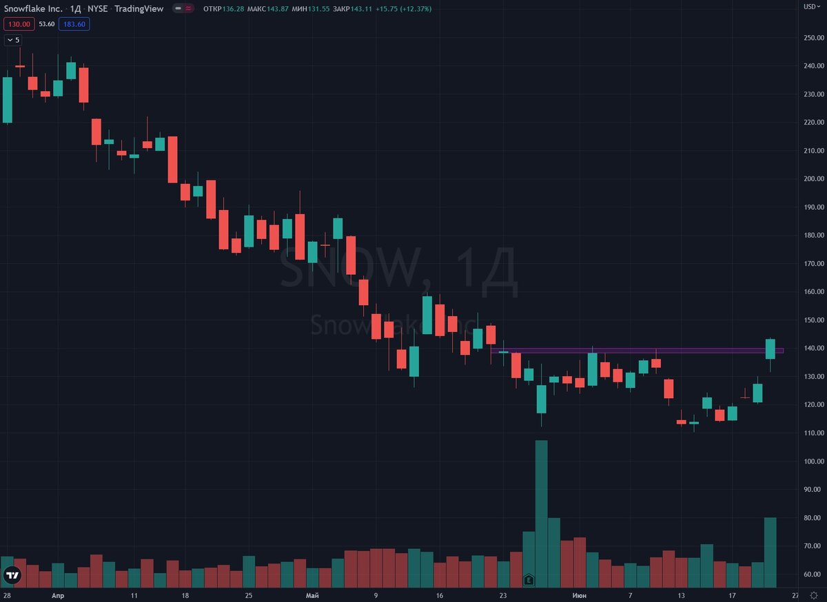 Бумажки Snowflake $SNOW подорожали на 12,4% и пробили уровень сопротивления в районе $140. Катализатором роста стали действия Марка Мерфи, аналитика из JPMorgan, который повысил рейтинг акций Snowflake с «neutral» до «overweight» и подтвердил их целевую цену $165, что на 15% выше их текущей стоимости. Комментируя повышение рейтинга, Мерфи сказал, что в JPMorgan уверены в том, что под руководством Фрэнка Слоутмана Snowflake способна генерировать существенную прибыль.