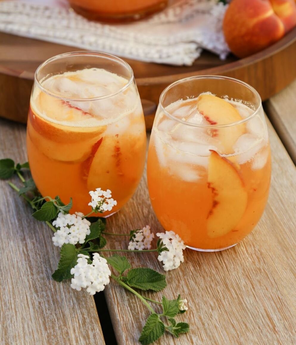 Интернет пестрит всевозможными рецептами лимонадов, но я хочу вам предложить не совсем обычный и очень вкусный вариант -#ПЕРСИКОВЫЙ ЛИМОНАД Для его приготовления нам понадобятся следующие ингредиенты: Воды - 4 стакана; Персики - 8 шт. крупно нарезанных + 1 персик очистить от косточек и разрезать на 8 дольек; Сахар - 150 гр.; Свежий лимонный сок (примерно 6-8 лимонов)- 1 стакан; Лед - 4 стакана. Воду, нарезанные #персики и сахар помещаем в кастрюлю и на среднем огне доводим до кипения, как только смесь закипит, уменьшаем огонь и варим еще три минуты. Накрываем крышкой и даем смеси настояться 20-30 минут. Когда смесь немного остыла пробиваем ее погружным блендером и ставим в холодильник охлаждаться на 3 часа. Хорошо охлажденную смесь протираем через сито, чтобы удалить все крупные частицы и возможные кусочки косточек. Добавляем лимонный сок. Из этого о