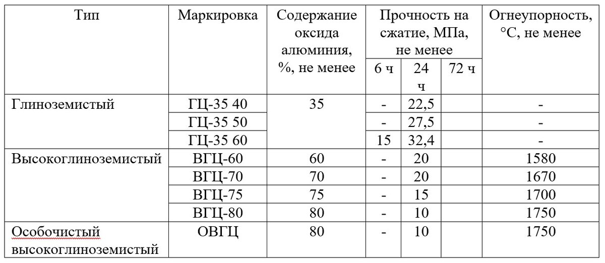 Этот тип цемента крайне редко встречается в магазинах. В таблице можно увидеть маркировку на мешках согласно ГОСТ 969-2019. Зачем нужен глиноземистый цемент и где его применяют? Как вы уже заметили по таблице выше, этому цементу присуще высокое содержание оксида алюминия (в общестроительном портландцементе его всего 4-8%), высокая ранняя прочность и огнеупорность. Эти свойства приобрел за счет своего минералогического состава, который представлен, в основном, минералами типа СхАу (хСаО*уAl2O3). При взаимодействии с водой эти минералы образовывают камень, отличающийся повышенной плотностью, коррозионной стойкостью, морозостойкостью и низкой усадкой. Именно поэтому глиноземистый цемент характеризуется быстрым нарастанием прочности, высокой экзотермией при твердении, повышенной стойкостью против коррозии в сульфатных средах и высокой огнеупорностью. По сравнению с ПЦ глиноземистый цемент обеспечивает получение бетонов и растворов большей плотности и водонепроницаемости. Из этих особеннос