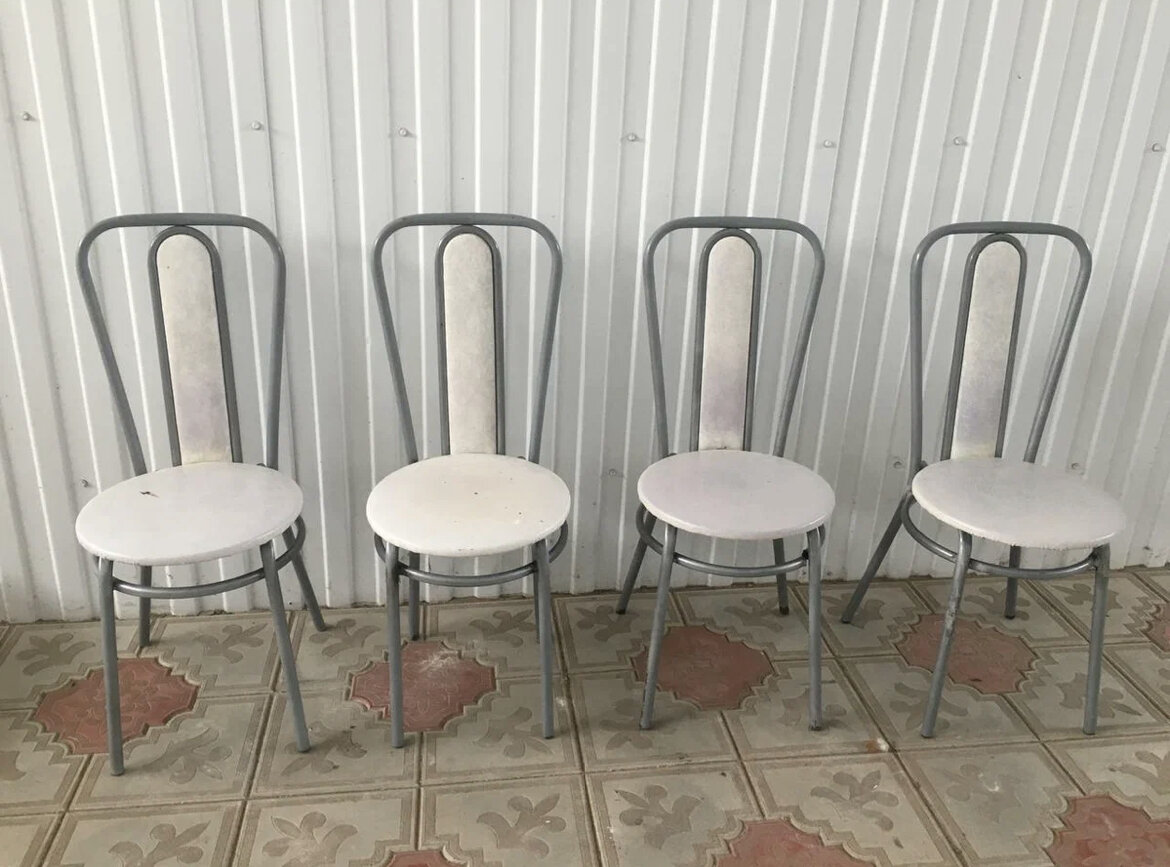 Всем доброго дня! Многие уже видели эти стулья моей свекрови у меня на канале. Год назад я решила их обновить, т.к. в таком виде они были просто ужасны. Пару стульев пришлось даже ремонтировать с помощью сварки, в этом нам помог сосед, что ему огромное спасибо! Смотрите сами в каком состоянии было покрытие после нескольких лет использования стульев. После перекраски и перетяжки они стали выглядеть так👇 Я использовала аэрозольный грунт и краску КУДО металлик золото. Но оказалось, что эта краска декоративная и не выдерживает интенсивного использования. Для люстры - да, но для стульев - нет! Хоть она и ложится идеально и за пару секунд преображает предмет. Несмотря на то, что я использовала аэрозольный лак для защиты покрытия, через год оно всё равно стерлось. Стул после почти года интенсивного использования👇 То что вы видите серым цветом, это грунт, он пока на месте. Теперь получается нужно что-то делать с этими проплешинами и я решила их просто подкрасить. Делов на пару минут, но по