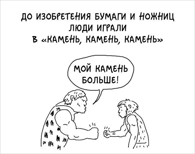 Игра «Камень, ножницы, бумага» достаточно древняя. И, по мнению одного из авторов комиксов - Duran, могла существовать даже до изобретения ножниц и бумаги. Вне зависимости от времени в разных частях света эта игра приобрела свои особенности и вариации. Менялись название, набор фигур и начальная считалочка. В нашем детстве даже в разных дворах одного микрорайона могли играть и называть эту игру по-разному. Я помню такие названия, как «Цу-е-фа», «Камано-моргано», «Чи-чи-ко» или даже простое «скинуться на кулачках». В нашей компании закрепилось нечто сборное - «Цу-зи-ко». Также был расширенный вариант с бОльшим количеством фигур, но скидывались мы все равно, как правило, классическими тремя. В чём, на мой взгляд, главная прелесть этой игры - это то, что для неё не нужен никакой дополнительный инвентарь или определённое пространство, таким образом в неё можно играть в любом месте в любое время. Хотя некоторые исключения всё-таки есть. Комикс от LINDAI В комиксах, которые мне попадались а