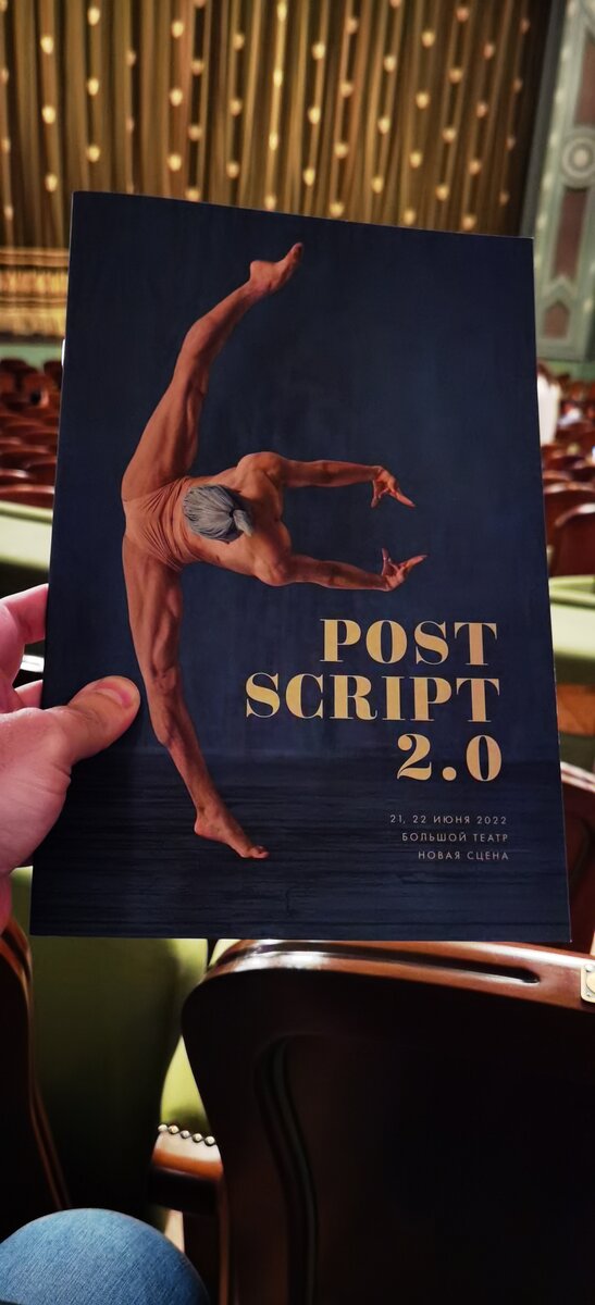 Посткрипт 2.0 Я все таки решил посмотреть новую программу, и как многие из московских балетоманов сделал это в последний момент. В новой программе есть два новых номера : Initium и Соната Фантазия. Остальное: старый добрый посткрипт и Фавн. Initium было очень непросто оценить так как свет был очень тёмный, и думаю что многие хореографические элементы остались неувиденными. Можно наверное было бы сделать свет хотя бы как Фавне. Но из того что мне удалось разглядеть мне очень понравилась пластика Насти Денисовой, и очень интересно было посмотреть на Ильдара Гайнутдинова. Но думаю что в Фавне было бы его посмотреть хореографически интереснее. Соната в целом мне понравилась. Хореография Посохова - это залог ожидаемого качества, и действо на сцене выглядело, как настоящий балет. Меня немного смутил хронометраж, и однообразность 1 части. Но музыка, и Анастасия Сташкевич, Алексей Путинцев, Вячеслав Лопатин, Артур Мкртчян сглаживали углы моего восприятия, и я получил удовольствие. Хотя Ратм