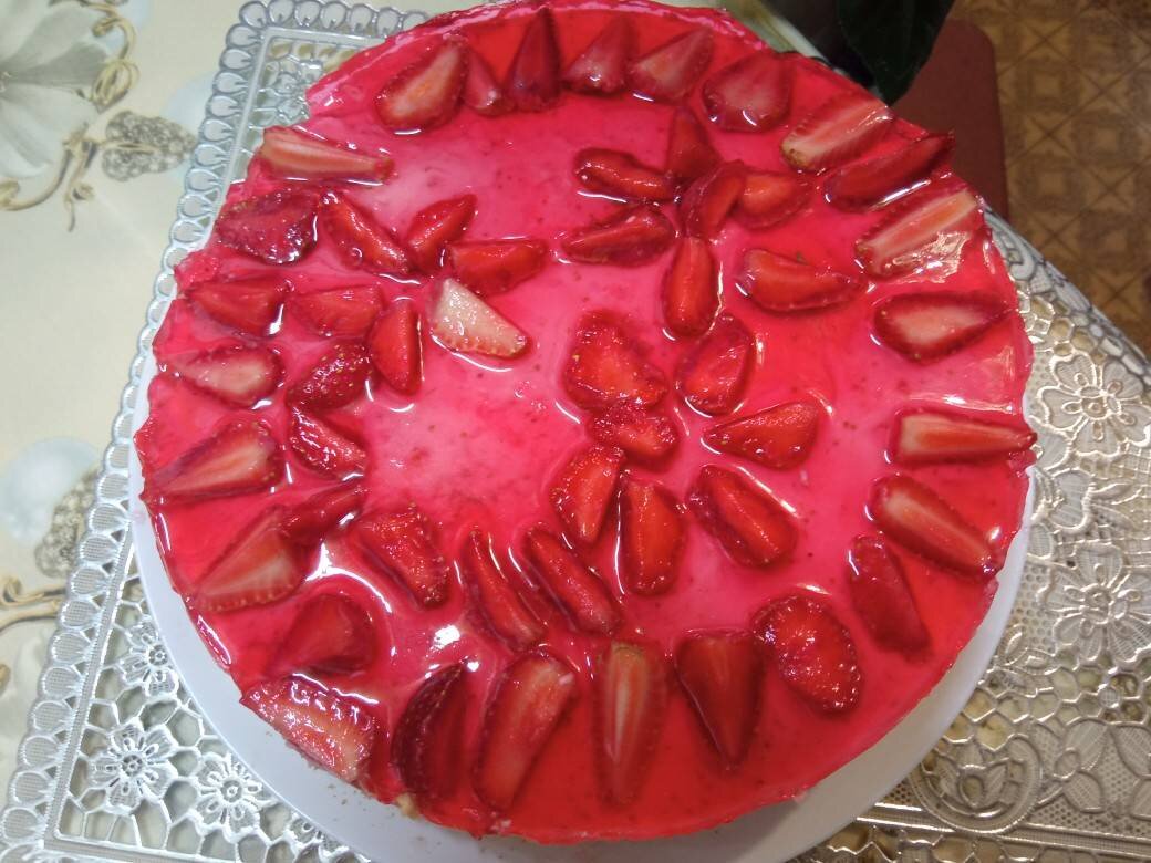 Сегодня на огороде собрали клубнику ,поэтому торт будет из клубники. Ингредиенты: яйца,100 гр муки,80 гр сахара, Для крема творог 400 гр,сахар 150 гр клубника 500 гр, Масло сливочное 50 гр, желатин 25-30 гр, Вода 200 гр, желе клубничное готовое 1 пачка, Для сиропа :коньяк ликер 50 гр Для украшения 150 гр клубникики, Приготовление бисквита. Белки отделить от желтков Способ приготовления: Белки взбить постепенно добавляя 80 гр сахара,взбивая до устойчивой пены. Желтки постепенно добавляем по одному В збитые желтки добавляем просеянную муку в три подхода,недолго взбивая на маленьких оборотах. Должно получиться однородное воздушное тесто Берём форму, на дно ложим кальку и выпекаем бисквит при 180 гр 30-35 мин Готовим клубничный крем 500 гр клубники взбиваем в блендере до однородной массы Желатин замачиваеи на 15 мин для набухания. Творог с сахаром взбиваем погружным блендером до однородной массы,добавив 50 гр сливочного масла и ещё раз взбиваем. Масса готова. Клубничный крем вводим в готов