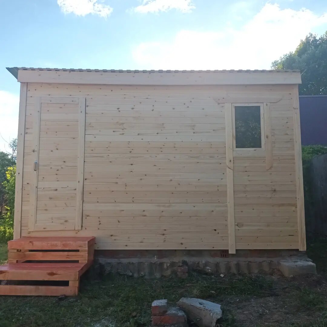 Хозблок 4 на 3. Вагонка, имитация бруса. 1. Брус обвязочный, 100 на 150. 2. Каркас брус, 100 на 50. 3. Крыша профнастил, односкатная. 4. Окно - 50 на 90 деревянное цена - 67000.