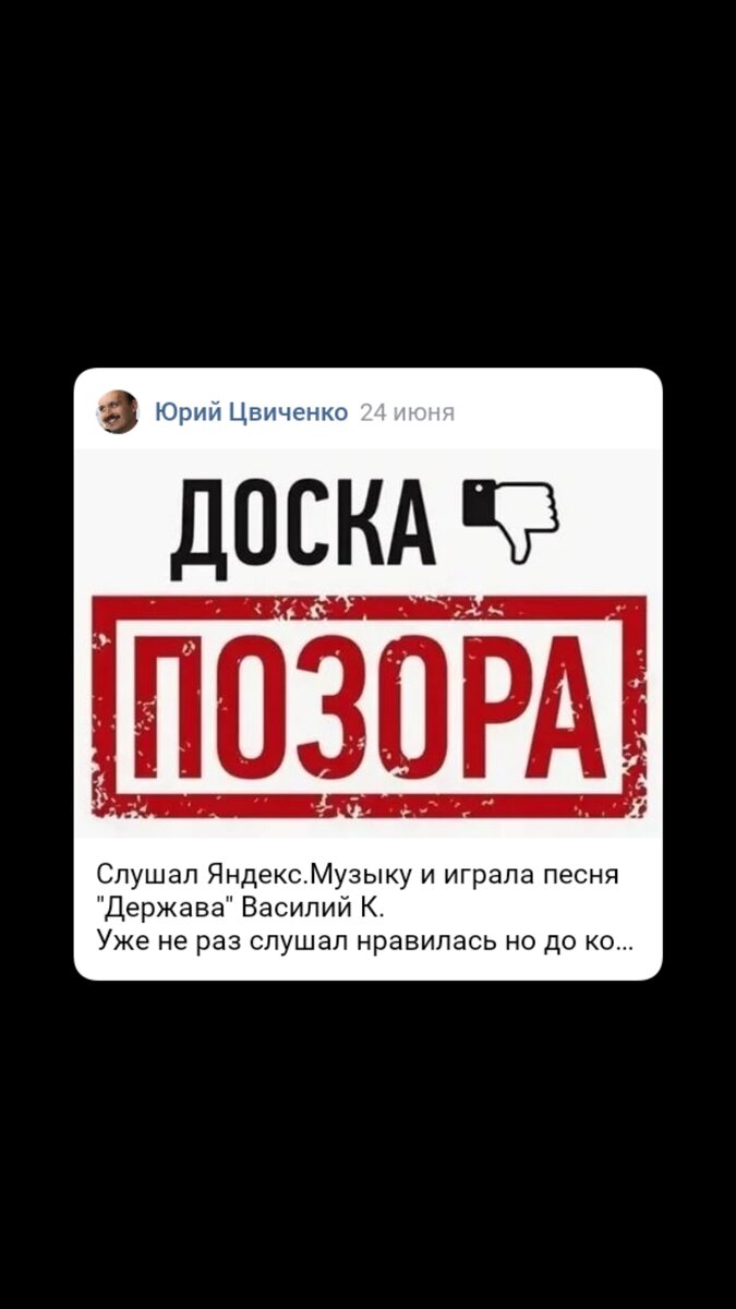 Тут хочу призвать всех читателей задуматься о песнях которые слушают наши дети. Сопротивляться насилию рекламы с символикой других стран (ненадежных партнеров нашей страны). Начну с песни к которой прислушался и онемел. Неужели такое можно слышать из приемников. Песня "Держава" Василий К. Последние слова текста песни звучат так: "... и алеют над нами флаги с чёрной свастикой в белом круге. " Слова о символе противном русскому человеку, ценяшему историю и подвиг русского народа. Сам лично запросил удаление этой песни у ВКонтакте и у Яндекс.Музыки. Вы со мной согласны?