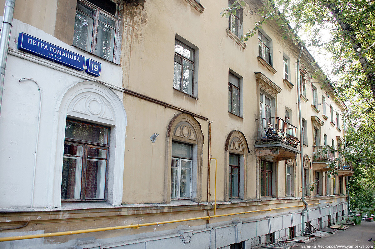 Улица Петра Романова, 11 – жилой дом (1950) Некоторые здания ансамбля вошли в программу реновации, но в связи с их исторической и архитектурной ценностью принято решение провести реставрацию с отселением жильцов.