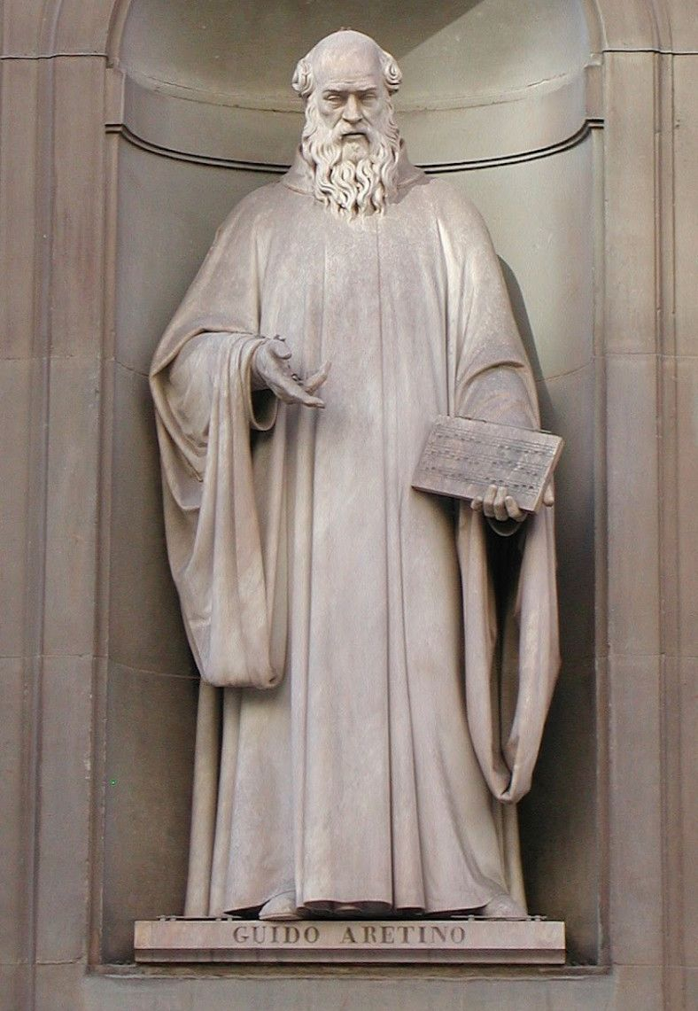 Изобретателем всемирно известной нотной грамоты считается монах Гвидо Аретинский (Гвидо д'Ареццо), живший в 990-1160 года нашей эры. Нотная грамота зародилась близь Флоренции, небольшом городке в Тоскане - Ареццо. Во Флоренции установлен памятник монаху: Гвидо был учителем музыки и хорового церковного пения при разных храмах, он много путешествовал по Италии, встречался в Риме с Папой Иоанном XIX и много трудился над созданием музыкальной грамоты, которая стала бы общепринятой. Однажды, стараясь придумать более легкий способ заучивания незнакомых мелодий для песнопения, Гвидо придумал систему сольмизации на основе акростиха молитвы к Иоанну Крестителю: UT queant laxis REsonare fibris MIra gestorum FAmuli tuorum SOLve pollute LAbii reatum Sancte Ioannes (В переводе с латинского: "Чтобы слуги твои голосами своими смогли воспеть чудные деяния твои, очисти грех с наших опороченных уст, о, Святой Иоанне") Названия всех нот, кроме первой, заканчиваются на гласный звук, их удобно петь. Слог u