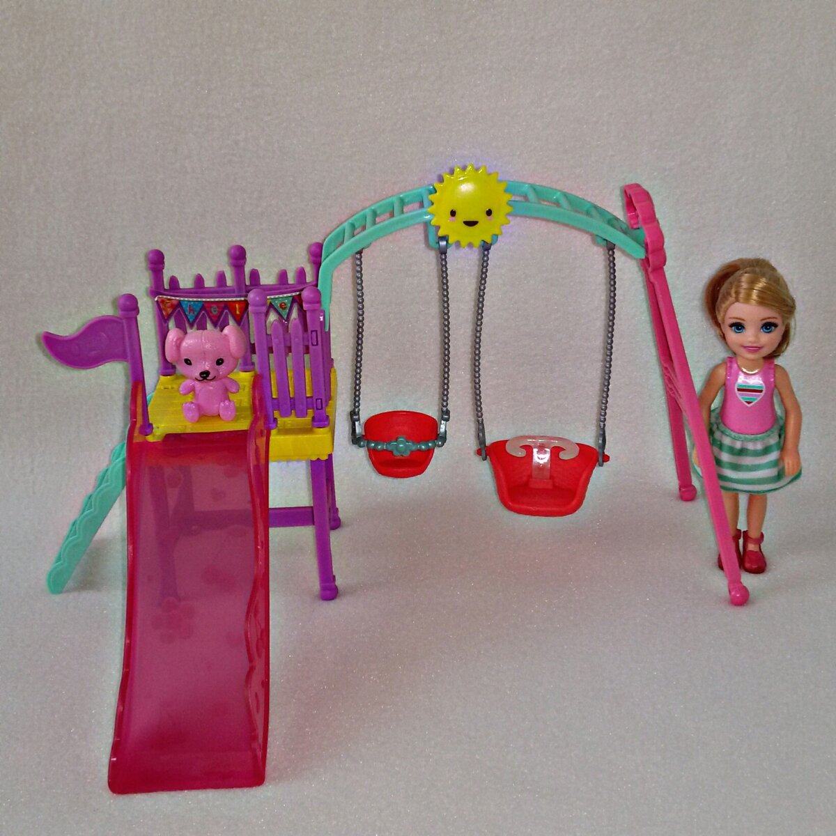 Какой же двор частного дома без горки и качелей? Вот и я подумала, что никакой:)… Что первое в продаже попалось, то и купила. Этот набор б/у. В коробке на территории РФ не нашла, а мне же срочно надо, я же вся сейчас в «домостроительстве»:). Покупала на Авито с доставкой. Пришлось понервничать: продавец активно переписывался, а отправил буквально в последний момент… Набор вроде и был хорошо упакован, но одна деталь погнута. Возможно, что оно так и было, на фото продавца эта часть закрывалась куклой, а дополнительные фото я не попросила. Пришлось аккуратно выпрямлять, вроде получилось. В остальном всё хорошо. Сама кукла милая, и практически новая, но жить у меня не будет (кому актуально — объявление в шопике) — в моей «Так себе Коллекции» Челси блондинок уже достаточно:). Игровой комплекс состоит из лестницы, горки и качелей. Маленькие качели подходят только для пупсиков со сгибающимися ножками высотой до 8 см. Другие — для куколок высотой до 14 см. Также в наборе есть игрушка. Игровой