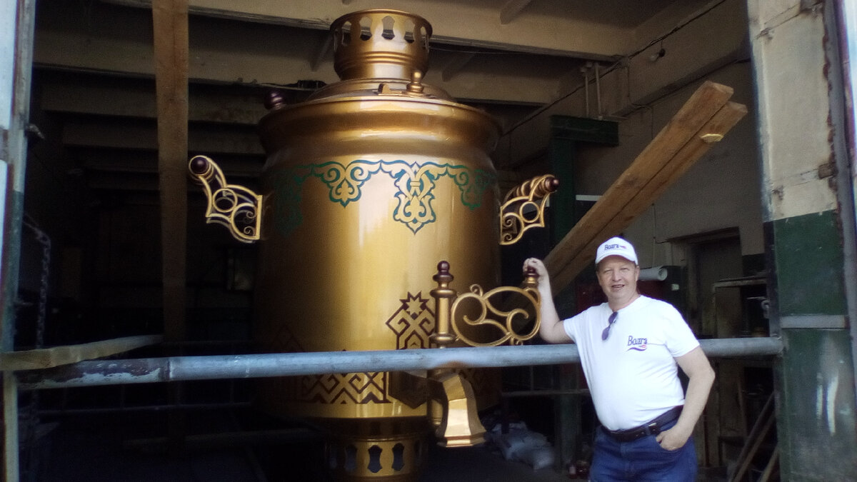 Царь-самовар. Вот такой царь-самовар сделали хорошие люди для нашего города . Внизу марийские узоры -а сверху татарские . Пока никто не знает где он будет стоять,но это ещё не весь самовар - ещё будет навершие -посмотрим? Ну и конечно фото с художником . Это ещё недоделанная работа и узоры ещё будут рисоваться ,давайте посмотрим эскиз чайника. Вот так будет выглядеть законченный чайник. Ну и конечно когда его поставят-это будет красивое и интересное место отдыха для жителей города . И конечно я сниму видео и покажу его Вам.