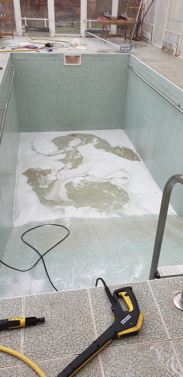 С чего нужно начать перед запуском бассейна ? Как правильно помыть чашу бассейна ? Как подобрать химию для бассейна ? Как часто добавлять химию и многое другое. И так разберём по порядку с чего начать? Осмотр чаши бассейна,оборудование на визуальные дифект и постараться устранить сомастаятельно или вызвать мастера. Следующие это чистка чаши бассейна? Как видим на фото очень большой налёт пытаемся его отмыть. Чистим чашу бассейна всеми доступными средствами только без фанатизма чтоб не протереть дыру в бассейне) средства можно использовать разные но главное после всех мероприятий опаласнуть чистой водой собрать воду подождать когда высохнет и натереть весь бассейн, ватерлинию,поручни лестницы и край бассейна Алгетином после дать высохнуть. Это важно так как Альгетин даст некую плёнку после нанесения это защитит Ваш бассейн от водорослей цветения чаши да и меньше всякая гадость прилепать будет. Как правильно подобрать химию? Ну тут наверно уже без мастера не обойтись так ка