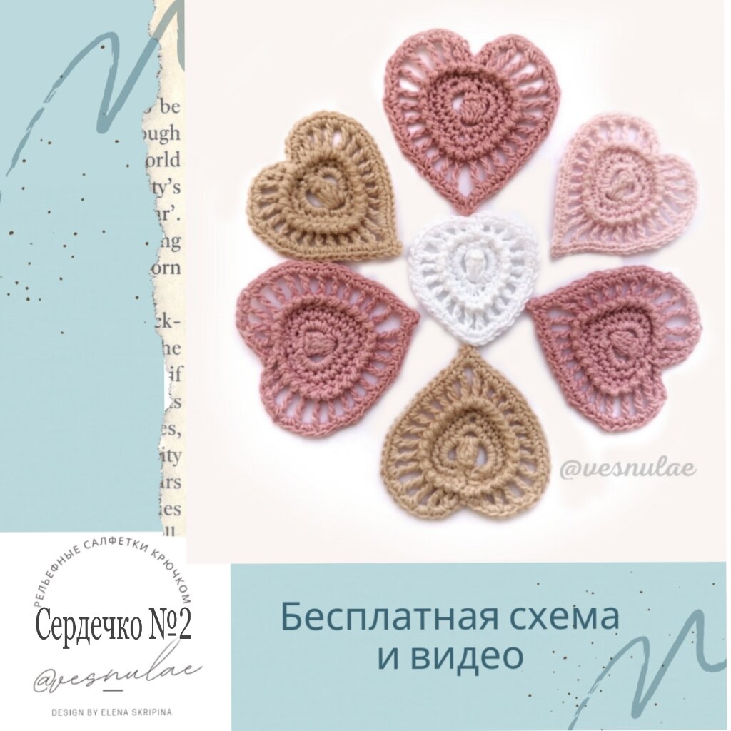 Предлагаю связать сердечко крючком. Дизайн мой - Елены Скрипиной - @vesnulae. Это сердечко можно подарить на праздник 8 июля - День семьи, любви и верности. Можно использовать как комплимент к основному подарку, в качестве топера для украшения торта, аппликации на одежду и для скрапбукинга. Пряжи потребуется совсем немного, поэтому можно использовать самые маленькие клубочки и остатки пряжи. А если связать из джутовой пряжи, то получится скраб-мочалка. У меня 3 мастер-класса по вязанию сердечек, и это Сердечко №2. Материалы: Видеоурок по вязанию сердечка смотрите по ссылке. Схема вязания Сердечка №2. 1-й ряд: свяжите цепочку из 11 ВП, Попкорн-5ССН в 6-ю ВП от крючка, соедините с первой ВП цепочки (Попкорн-5ССН, 2 арки-5ВП). В скобках здесь и далее указано итоговое количество столбиков и петель ряда. 2-й ряд: 1 ВПП, 6 СБН в арку-5ВП, 5 СБН в основание Попкорна, 6 СБН в следующую арку-5ВП, соедините (17 СБН). 3-й ряд: 1 ВПП, СБН в следующий СБН, (2 СБН в следующий СБН) – 3