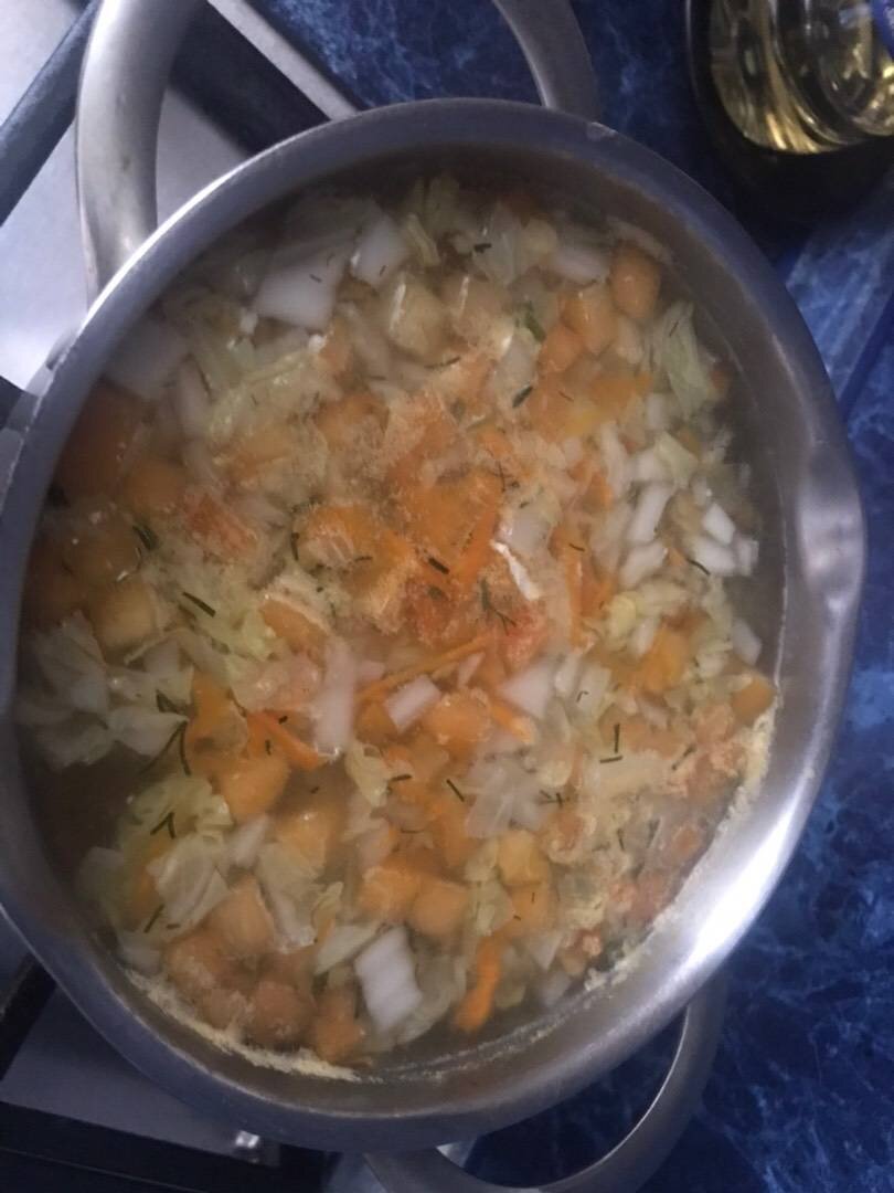 Если боитесь аллергии на курицу, можно использовать индейку, выйдет не хуже))) Не смотря на указанное время, готовиться просто и быстро, главное заранее приготовить мясо))) Ингредиенты: куриной грудки, пекинской капусты, картофель, луковицы, небольшой моркови, Бульон, помидорки небольшой, Соль, лавровый лист, перец горошек Способ приготовления: Я заранее отвариваю в подсоленной воде с горошком и лавром филе курицы, разрезанное на части, чтобы порционно было легче потом делить мясо, т к варю на 2 дня. Курицу беру фермерскую или Кудашку для деток. Пока вариться филе, готовлю овощи. Чищу, нарезаю мелко, морковь для самых маленьких вообще лучше тереть, т к она переваривается тяжелее, капусту пекинскую беру, потому что она нежнее, чем обычная) В процеженный бульон выкладываю сначала картофель и морковь, даю закипеть. Лаврушку и перец лучше уже убрать из бульона, чтобы не попалось ребёнку) Потом добавляю капусту и помидорку, и уже в конце лук. Если ребёнок уже больше года, можно для запаха д