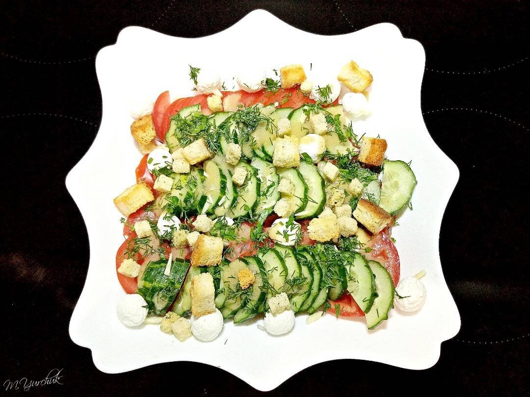 #летнееменю Салат по мотивам, что нашла в холодильнике, или «Я его слепила, из того, что было». В 100 г – 94,9 ккал Ингредиенты: – помидоры, - огурец, – творожный сыр, – сухарики, – чеснок, Зелень, Для заправки: , – лимонный сок, – растительное масло, – горчица, – соль Способ приготовления: Помидоры и огурец нарезать полукольцами. Чеснок и зелень нарезать мелко. Из творожного сыра скатать маленькие шарики. Собрать салат в миске, сверху выложить творожные шарики и сухарики. Полить заправкой. Для этого соединить все составляющие и хорошо перемешать. Готовьте с любовью и приятного аппетита!!!!