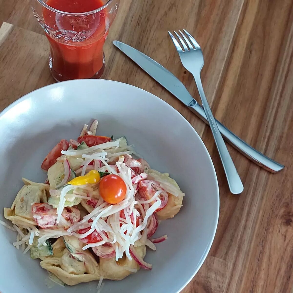 #смаки Ще один варіант знаменитого німецького нудель салату ( макаронного салату) Тортелліні це ті самі макарони, тільки зроблені у вигляді наших пельменів з різноманітними начинками. В мене сьогодні з шинкою і моцарелою. До салату в мене домашній майонез з куркумою і прованськими травами. Ингредиенты: тортелліні (450 гр), помідорок черрі, невеликих огірка, болгарська перчина, маринованої синьої цибулини, майонез, сіль, перець за смаком Способ приготовления: Відварити тортелліні згідно інструкції. Додати порізані крупно овочі. Цибулю попередньо порізати тонкими пір'їнами і замаринувати в суміші цукру і виноградного оцту. Посолити, поперчити, додати майонез або домашній майонезний соус, перемішати і трошки охолодити в холодильнику) Заміняє і салат і гарнір, коли треба швиденько щось зготувати після роботи)