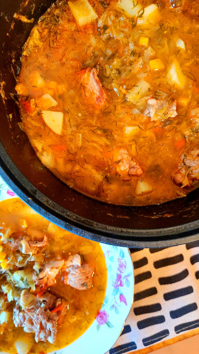 Вчера на ужин захотелось всем лагман. А что, жара спала, можно спокойно готовить, неспешно посидеть за столом, не обливаясь потом. Днём мы были на рынке и купили баранью шею. Ой, нет, не так! Шею молодого барашка. Мне кажется, что продавец лично знал всех родственников этого молодого барашка. Впрочем, барашек был хорош) Я взяла шею барашка, которую продавец порубил на небольшие кусочки и свинину, мякоть, ошеек. Мясо средним куском. В казанке разогрела немного растительного масла. Обжарила баранину и свинину, до уверенной румяной корочки. Залила водой, добавила соль, перец горошком, лавровый лист, и подпеченный лук и морковь. Оставила вариться, на небольшом огне, прикрыв крышку. В это время - Морковь и лук спассеровала. Добавила болгарский перец и свежий помидор, и ещё немного обжарила. Картофель почистила, нарезала некрупным кубиком. В насыщенный, ароматный, красивого цвета бульон, ввела картофель и оставила вариться, до готовности картофеля. Затем добавила пассеровку из овоще