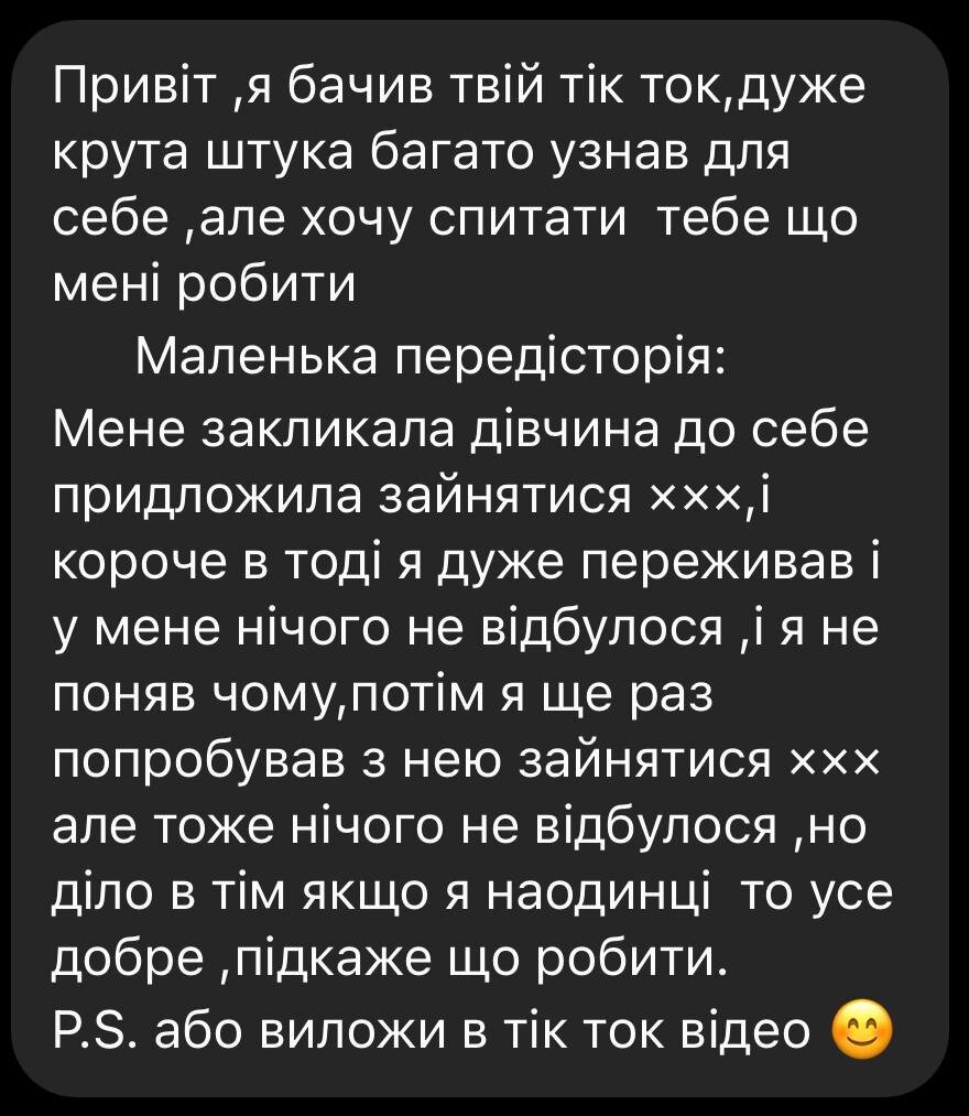 К ФОТО - Перевожу на русский: у парня во время мастурбации всё ок, а как доходит до секса, член не стоит. Спрашивает, что это такое и что делать. Вас удивит, насколько это частая проблема :) Первый раз я с ней столкнулась лет в 19, когда у меня появился парень – красивый, как греческий бог, редкий умница, из хорошей семьи и так далее. Но вот когда дело доходило до постели, пенис просто отказывался работать. Притом, что во время мастурбации, по его словам, всё было ок. Я, как любая молодая дурочка, даже думала, что проблема во мне. Пока не разобралась, как это у мужиков работает. Стоит начать с того, что если проблема возникает только во время секса, она никакая не физиологическая. То есть никакой импотенцией и не пахнет. Проблема – в голове. Ведь у мужиков, как и у нас (помните, я говорила о том, что мы на самом деле очень похоже устроены?) эрекция тоже напрямую связана с психоэмоциональным состоянием. Чрезмерное волнение, страх неудачи, комплексы по поводу внешности или формы/размера