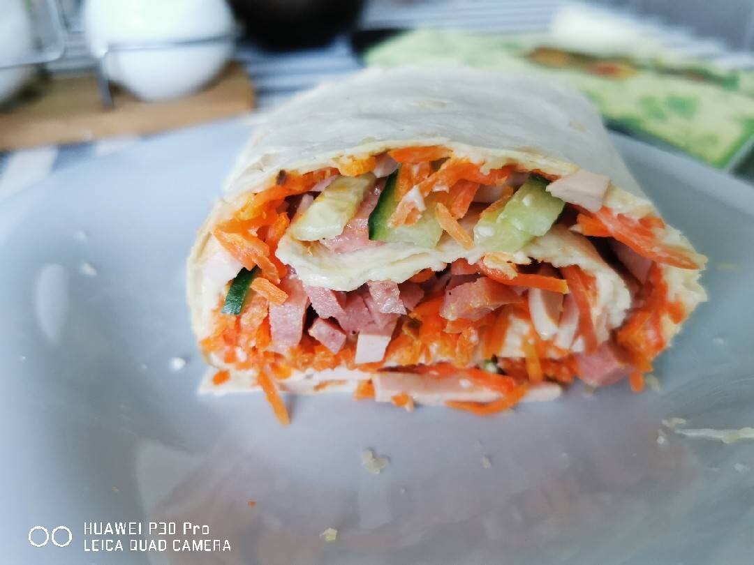 Все ингредиенты беру по вкусу 😉 Ингредиенты: Мягкий сыр (можно плавленый или твёрдый натереть на тёрке), Майонез, Чеснок , Морковь по-корейски, Любая колбаса, отварное или копчёное мясо (на ваш вкус), Огурец небольшой Способ приготовления: В миске смешиваем сыр, майонез и чеснок. И этой смесью смазываем лаваш. С корейской морковки убираем всю жидкость и выкладываем её на лаваш, смазанный сырной смесью. Огурец режем соломкой и выкладываем на морковь. Много огурца резать не нужно, он даёт жидкость, которая нам не нужна. Также соломкой режем колбасу или мясо и выкладываем сверху на огурец. Лаваш сворачиваем рулетом. Разрезаем его и наслаждаемся вкуснятиной. Лаваш можно сложить конвертом или скрутить как шаурму. В любом случае очень вкусно. Приятного аппетита 😋