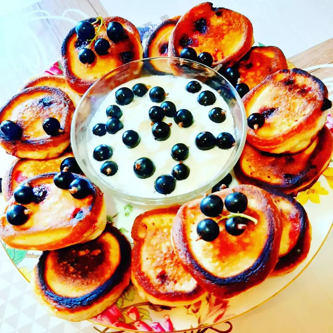 Оладушки с чёрной смородиной и сметанным кремом🫐