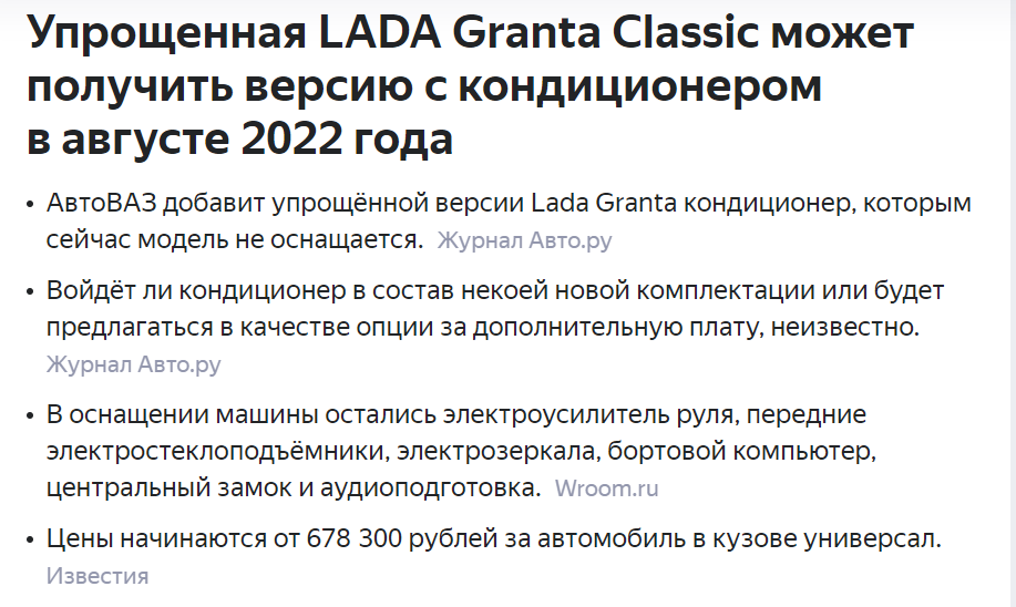 Нас тут "дзен" на днях учил шутить правильно, ну что ж, решил и я похохмить немножко... Новость - анекдот! Шёл 2022 год, по миру выпускают электрокары беспилотные, а у нас... А у нас, вот: Честно, я аж как-то не сразу своим глазам поверил! Покопался, почитал, точно! Кондиционер, мать его за ногу! Я как человек от автопрома далёкий, думал, что он там и так есть, дурак человек, что сказать! Самое прикольное, что в самую жару, в комплектацию входил только обогрев :)) А теперь, случился мега-прорыв и к августу, а то и к сентябрю, они воткнут туда кондей... И вот где тут шутить? Про что? Новость сама по себе на идиотскую шутку похожа... А тем временем... Больше всего веселит, что по мнению многих граждан, это я гадина и предатель, потому, что про всякое такое пишу, а не те демоны, которые довели всё до такого состояния...