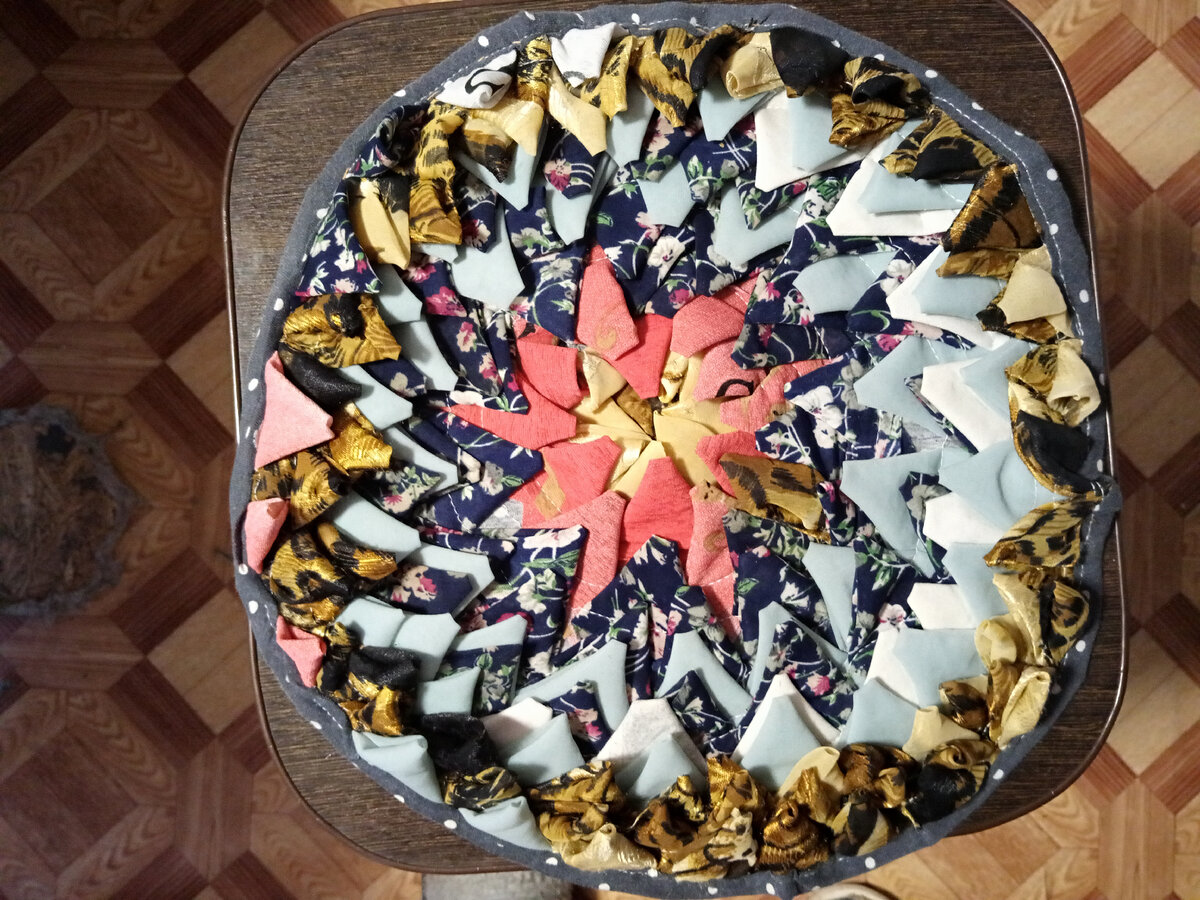 Добрый день дорогие друзья! Сегодня я хочу рассказать о своём опыте шитья из не нужных квадратиков из синтетической ткани бывших в употреблении. Такие ткани которые тянутся, шёлковые, стрейч, шифон и т. д. Вот такой коврик на стул я сшила. На резала квадратиков 9*9, сложила по диагонали . Надеюсь понятна последовательность изготовления треугольников. Взяла ткань любую. Шить начала с середины с 6 треугольников. Шила на машинке, но можно и вручную, если машинке не может прошить. Шила по кругу в одном направлении. На шила столько рядов сколько мне было нужно . Стулья ведь у всех разные. У меня получилось 12 рядов. Обрезала лишнюю ткань по кругу. Вырезала ещё один круг больше диаметром на 3-4см больше. Скрепила булавками и об шила сначала вручную, а потом на машинке. Можно добавить синтепон, но я его не добавляла. Таким способом можно сделать коврик в ванную или прихожую. Это у меня первый опыт. Может и коряво получилось. Не судите строго. Спасибо за просмотр. Подписы