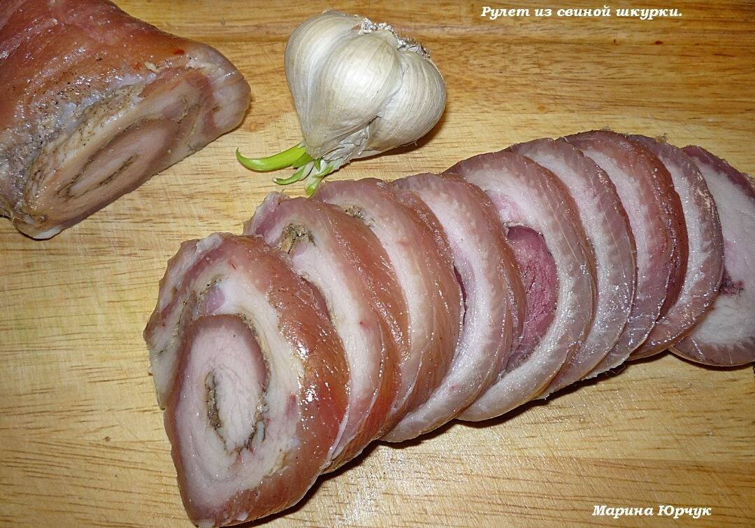 Многие хозяйки при обработке мяса кожицу просто выбрасывают, не найдя ей применения. Приготовьте нежный, мягкий, невероятно вкусный рулет из свиной шкурки, и не пожалеете. Закуска получится сочной, аппетитной и весьма экономичной. Ингредиенты: - ч/м перец, - чеснок, - лавровый лист, - свиая шкурка, - соль Способ приготовления: Промойте свиную кожу как можно тщательнее, соскоблите все загрязнения ножом. Обсушите бумажными салфетками и выложите на блюдо или досочку. Равномерно посыпьте солью (1 ст. л.) и молотым черным перцем. Выложите на шкурку нарезанные зубчики чеснока. Сверните кожу рулетом, прижимая ее изо всех сил, и свяжите. Поместите приготовленный рулет в казан или кастрюлю с антипригарным дном, всыпьте оставшуюся соль, лавровые листья. Охлажденный рулет из свиной шкурки нарежьте тонкими ломтиками и подайте к столу. Не забудьте про ломтики хлеба и пикантные соусы с горьким привкусом: горчицу, хрен. Угощайтесь и приятного аппетита!!! Залейте водой и поместите на плиту, отварите в