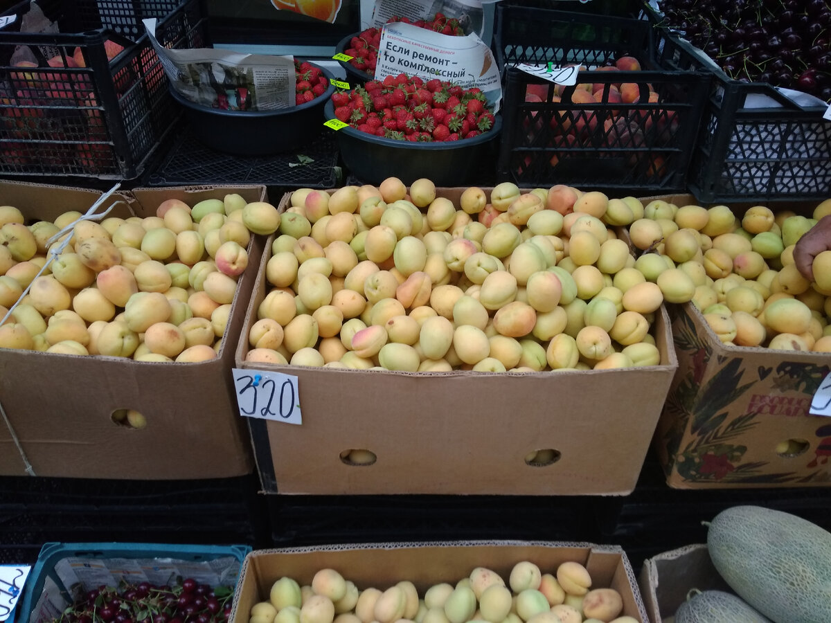 Итак, давайте сегодня поговорим о ценах в Ереване на фрукты и овощи. Месяц назад я делала обзор на эту тему в статье "Что сейчас продают на рынках Армении". Теперь давайте сравним, что же изменилось за это время - что подешевело,а что подорожало. Начнем с абрикосов. Сейчас самый сезон местных абрикосов,поэтому цены падают буквально каждый день. Надо отметить, что армянские абрикосы действительно очень вкусные. Не зря они являются чуть ли не визитной карточкой Армении. Честно признаюсь, я ни разу в России таких сладких и сочных не встречала - ни на юге России, ни в средней полосе нашей страны. Абрикосы из Араратской долины крупные, хрустящие (словно немного неспелые), но (!) при этом очень сочные и сладкие. Пожалуй, это мой фаворит среди местных летних ягод и фруктов. Средняя цена на них сейчас составляет 280-350 драм (40-52 руб.). А на компот я взяла самые дешёвые - за 250 драм (37 руб.) и они оказались ещё слаще даже, чем за 350:-). В общем, абрикосы тут как у нас в России яблоки- на