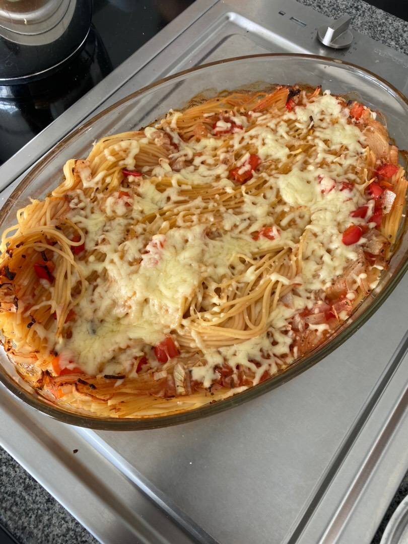 Очень практичный рецепт из Инстаграм #паста #макароны Ингредиенты: Спагетти, Бульон куриный, Томатная паста, Соль и специи (у меня прованские травы), Лук, Перец болгарский, Сыр Способ приготовления: В форму поместить спагетти, при необходимости поломать их. Нарезаем лук и перец. Выкладываем на спагетти, добавляем соль и специи. Бульон смешиваем с томатной пастой. Заливаем спагетти. Доливаем воду, чтоб она покрыла спагетти на 1-2 см. Отправляем в духовку на 45 минут при 200 С. Затем перемешиваем (необязательно) и посыпаем тертым сыром. Отправляем ещё на 15 минут. Подаём порционно.