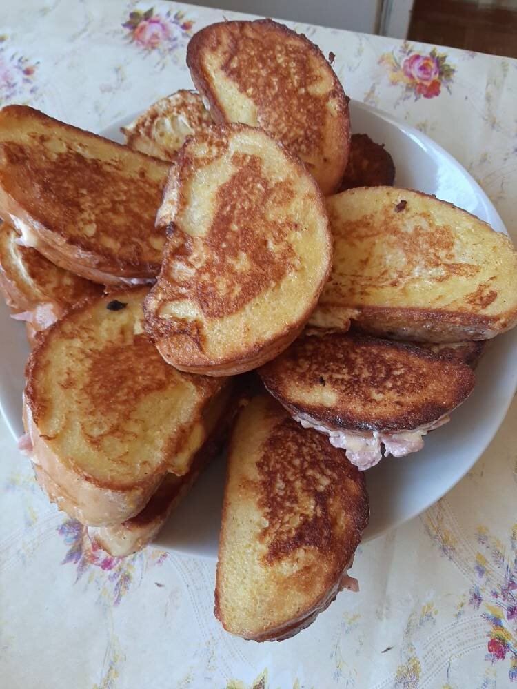 #едаизбатона #кармашкисначинкой #гренки #горячиесэндвичи #жареныйбатон Как-то раз ,побывав в гостях у сестры я попробовала это блюдо, на вид обычные гренки ....но попробовав я была в восторге, это очень вкусно и не сложно приготовить. Я попробовала и у меня получилось и домашним моим тоже всем понравились эти кармашки из батона. Ингредиенты: батон, яйца, сметаны, колбаса вареная (любая, завалявшаяся дома), сыр, майонез, соль, масло раст (для жарки) Способ приготовления: Для начала берем батон и нарезаем его таким способом, чтобы получился кармашек (в него мы будем закладывать начинку). Дальше для начинки натираем на крупной терке колбасу и сыр перемешиваем, потом добавляем майонез для сочности(на свое усмотрение количество майонеза). Дальше заполняем наши кармашки из батона начинкой, которую мы приготовили. Когда все кармашки заполнили начинкой откладываем в сторону. Следующим этапом берем глубокую миску и выбиваем туда 4 яйца и 2 ст. л. сметаны + щепотка соли и это все размешать до од