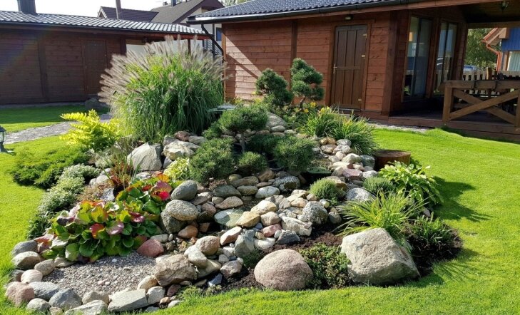 Альпийская горка и газон вокруг нее