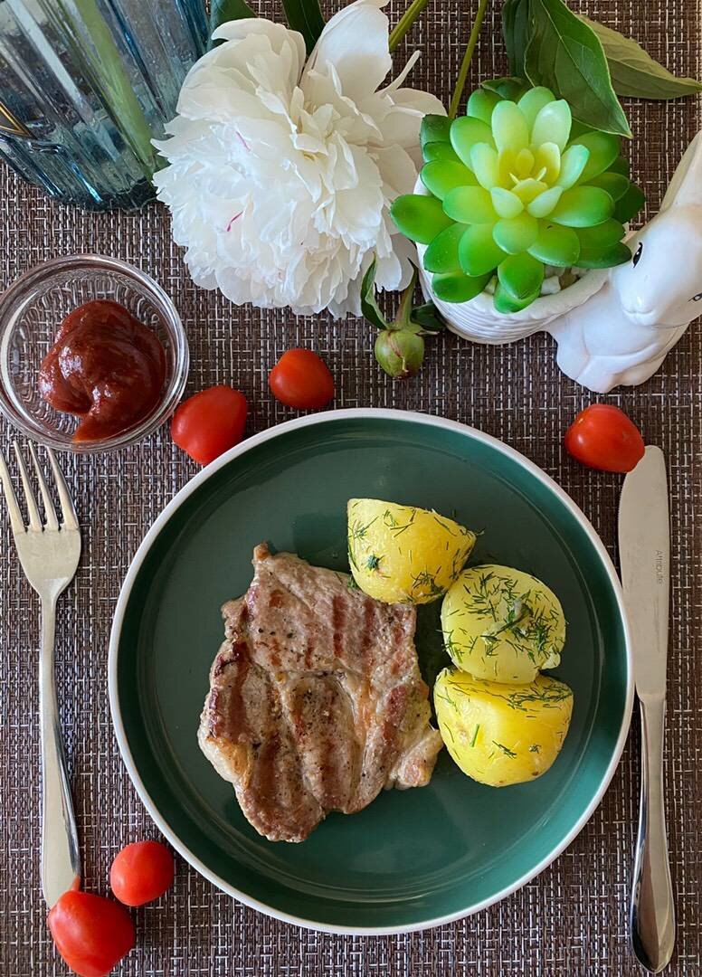 Когда очень хочется шашлыка, но из-за 3-4 кусков не хочется возиться с углями и мангалом, всегда выручает сковорода-гриль. Сочная нежная свиная шея готовится очень легко и быстро. А получается всегда вкусно! #летнееменю Ингредиенты: Мясо свиной шеи , луковица, Соль, перец Способ приготовления: Маринуем мясо - солим, перчим. Лук нарезаем произвольно, не очень мелко, т.к. он нам нужен только для сочности мяса, а потом мы его выкинем. Перекладываем куски мяса нарезанным луком и плотненько укладываем. Накрываем пленкой или пакетом и оставляем на несколько часов. Обычно я готовлю все до обеда, чтобы потом на ужин пожарить. Обжариваем мясо на сухой хорошо прогретой сковороде-гриль с каждой стороны по 4 минуты. Затем выкладываем мясо на фольгу, заворачиваем и укладываем обратно на сковороду «отдыхать», пока сковорода остывает. Подаём с отварным молодым картофелем и любимым соусом. Приятного аппетита!