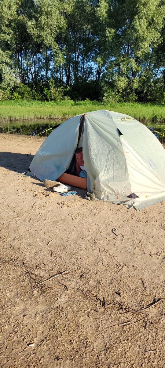 Вставал ночью в 3 посмотреть уровень воды, помня случай перед чебоксарским шлюзом, не хотелось повторения. Глубина под Маугли сейчас 10см если уйдет вода, будет катастрофа... Но к счастью, воткнутые в берег с вечера палочки-индикаторы, показали полное отсутствие признаков ухода воды, и я спокойно пошел спать дальше. В 6 вышли из палатки на свет божий) вокруг красота, зерколо реки, нежное утреннее Солнце, и наш прекрасный пляж) Позавтракали, и неспеша, чередуя с купашками и загорашки, начали собираться к отходу. Я переставил Маугли из бухточки, на берег протоки, ветра нет, постоим так. Пользуясь береговой стоянкой, вырыл яму и сжег в ней весь горючий мусор. К 9 30 собрались, еще раз прогулялись по острову, офигенское место! Спасибо Волга за такой подарок! В 9 40 пошли вперед! До НН отсталось всего 65 км, можно было их пройти одним днем, но решили еще покайфовать на реке, и пройти этот участок в 2 этапа. Сегодня заночуем на пляже возле чего-то имени Калинина... а завтра уж и в НН.