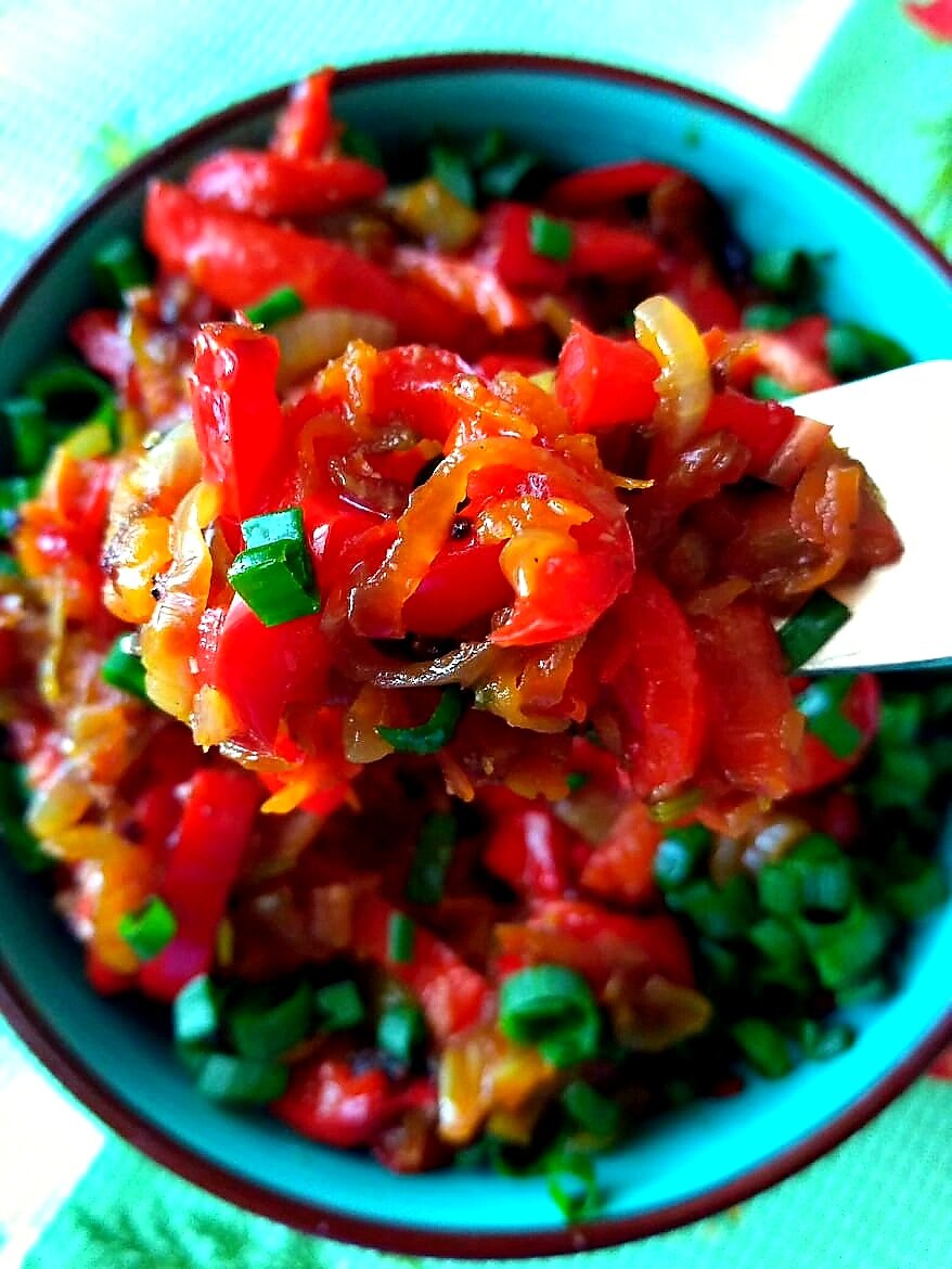 С уверенностью в сто процентов, могу сказать, что аромат блюд из перца, доносится из каждого дома) Салаты из запеченного перца, икра из печеного перца, перец фаршированный, лечо и ещё и ещё масса всяких блюд, салатов, сальсы. Лагман, шурпа, везде нужен этот прекрасный, вкусный и ароматный овощ! Я покажу сейчас самый простой рецепт. Однако, не смотря на простоту, блюдо очень вкусное! Жареный перец. Простая, ароматная и вкусная закуска, типичная для юга . Лето - время перца и блюд из него. Тарелка этой закуски всегда есть у меня на столе. Вкусная она и в горячем и в холодном виде. Отрезаешь кусочек батона, сверху закуску из перца, ломтик холодной курятины, веточку зелени - красота. Стакан холодного компота, и прекрасно) Готовится легко, по материальным затратам - копейки. Вкус и аромат юга на вашей кухне. Две морковки и две луковицы, среднего размера, 700 гр сладкого перца, лучше красного. Овощи вымыть и почистить. Теперь готовим, методом последовательной закладки. Ставим разогревать