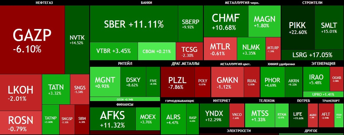- зеленый цвет на карте рынка означает, что акции набрали в стоимости.