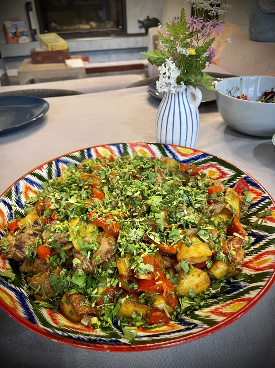 Рецепт на 6 человек 1 кг мяса (например свиная вырезка) 5 крупных картофелин 3 помидора 2-3 болгарских перца 2 средних луковицы 5-7 зубчиков чеснока 30 г зелени соль, специи (хмели сунели) Приятного аппетита!