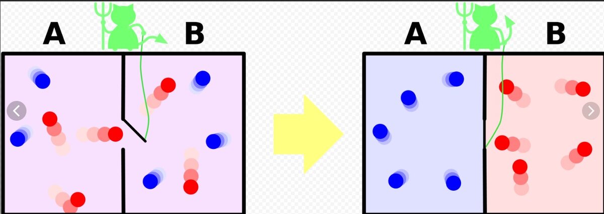 Рис.1 «Демон Максвелла» - сохранение существования системы против градиента энтропии за счёт организации специального механизма разделения энергетически активных (красные кружочки) и неактивных частиц (синие кружочки), т.е. искусственного состояния повышенной энергии в секторе B.