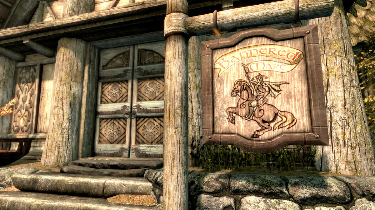 Первым крупным городом, в который попадает довакин по сюжету, становится Вайтран. Он удобен в экономическом и политическом плане расположения, и, как во всяком приличном торговом городе, на центральной площади находится таверна. Таверна "Гарцующая кобыла" (англ. The Bannered Mare), к сожалению, только в русской локализации имеет отсылку к роману-эпопее Дж. Р. Р. Толкиена "Властелин Колец" (англ. The Lord of the Rings), а именно к трактиру "Гарцующий пони" (англ. Prancing Pony). А вот вывеска таверны с изображением вздыбившегося коня и бард Микаэль напоминают логотип Ferrari и одного из самых известных гонщиков "Формулы-1" Михаэля Шумахера.