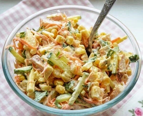 Всем доброе утро, желаю всем хорошего дня и отличного настроения🤗Сегодня у нас вкусный и быстрый салат который понравится всем кто любит корейскую морковку! Ингредиенты: 200 г куриной грудки 150 г огурца свежего 150 г корейской моркови 150 г сыра маложирного 0.5 банки кукурузы 2 зубчика чеснока Для соуса: Йогурт натуральный 100 г 1 ст.л. горчицы зелень по вкусу Приготовление: Куриное филе отварить, остудить. Нарезать огурцы, сыр и курицу соломкой. С кукурузы слить жидкость. Смешать все ингредиенты, добавить морковь, измельченный чеснок и заправить горчично-йогуртовым соусом. Дать немного настояться, ещё раз перемешать и подавать к столу. Всем приятного аппетита, подписывайтесь на канал и ставьте класс 😍👍 #салат #еда #рецепты #кулинария #быстрыцрецепт