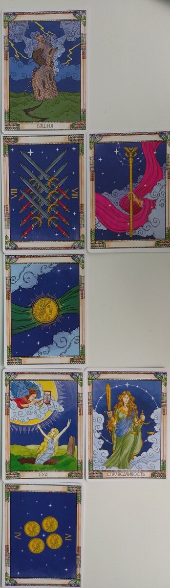 Ситуация на сегодняшний день. Несчастливая карта, обозначающая крушение планов и надежд, будь-то разрыв отношений или внезапная травма либо болезнь. Вас ждут резкие перемены, конец привычной жизни, прекрасная возможность использовать этот момент для самосовершенствования. В перевёрнутом виде означает длительные переживания. В любовном раскладе-серьезные конфликты, неверность. Что мешает. ПРЕПЯТСТВИЯ. Что может помочь. УСПЕХ. К чему может привести. ПРИБЫЛЬ. Что делать чтобы достичь цели. Карта достижения цели. Означает скорые перемены к лучшему, ваши старания вознаградятся, главное-это осознать старые ошибки и извлечь из них урок. В перевёрнутом виде указывает на затяжные перемены в жизни или чувство сожаления. В любовном раскладе- конец старой жизни, переход на новый уровень отношений или начало нового романа. Чего не следует делать. Торжество справедливости. Карта означает, что справедливость будет восстановлена. Если вы всё делали правильно, то это предостережение. Возможны