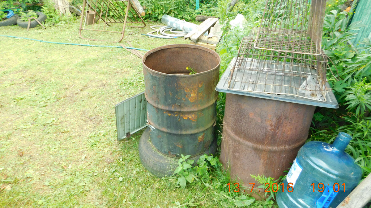 На снимке два железных бочонка по 100 литров. Естественно со свалки. Крышки от газовых плит, которыми я их прикрывал оттуда же. Когда-то свалки наши были богаты.