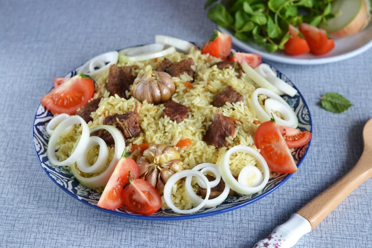 Приготовь сытное, вкусное и ароматное мясное блюдо! Говядина считается более жесткой по сравнению со свининой, но плов в казане из говядины на плите, получается очень нежный и мясо буквально распадается на куски. Карри окрашивается рис в золотистый цвет, а аромат в кухне стоит невероятный. СОСТАВ / ИНГРЕДИЕНТЫ на 8 порций Говядина (мякоть) 600 гр Рис 600 гр Растительное масло 200 мл Морковь (крупная) 1 шт. Лук 1 шт. Чеснок (2 головки) 15 гр Соль 1 стол.л. Карри 1 чайн.л. Специи сухие (для плова) 0.5 чайн.л. Перец черный молотый по вкусу ШАГ 1: Подготовьте все необходимые ингредиенты для плова. желательно использовать только мякоть говядины без твердых прожилок и сухожилий. Рис для плова нужен специальный, он так и называется "Для плова", либо подойдет обычный пропаренный рис, который хорошо сохраняет форму при термообработке. ШАГ 2: Говядину тщательно промойте и нарежьте средними кубиками. Слишком мелко резать не стоит - говядина может пересушиться и стать жестковатой, а крупные кусоч
