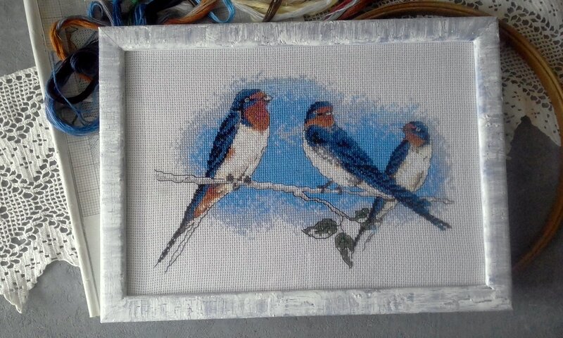 В середине апреля был начат проект под названием " Ласточки". Мы ждали весну, а она задерживалась. А теперь весна пришла, ласточки во всю бороздят небесные просторы, но лето нынче холодное. Я очень довольна работой. Здесь нет половинчатых крестиков, нет полукрестиков. И пусть много похожих оттенков, они не мешали, а помогали работе. И пусть иногда путалась в близких значках, это развивало внимательность. Хочется сказать про материалы. Нитки подбирала сама, их у меня много осталось с прошлых проектов. Канву покупала на Озон (50*50 см), еще рамку купила 21*30 см. Вот такой проект на 2,5 месяца у меня получился. Все посты по этому проекту соберу в отдельную подборку, чтоб вы могли посмотреть, как он начинался и продвигался. Спасибо, что читаете меня! Всем хорошей погоды.