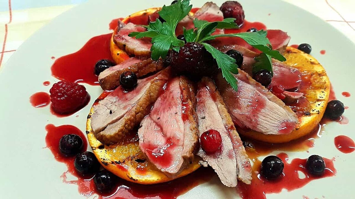 ИНГРЕДИЕНТЫ: · 1 ч. л. сушеного тимьяна · сахар – 0,5 стакана · 100 г малины · 50 г красной смородины · соль · 200 г черной смородины · 100 г ежевики · корица · 1 ч. л. крахмала · масло растительное · 0,5 стакана красного сухого вина · 800 г филе утки ПОШАГОВЫЙ РЕЦЕПТ ПРИГОТОВЛЕНИЯ: - Утиное филе вымыть, обсушить бумажными салфетками и нарезать очень тонкими пластинками. - Положить куски на разделочную доску, накрыть пищевой пленкой и хорошо отбить. Снять пленку. Смешать тимьян с солью и перцем, присыпать этой смесью мясо, вновь накрыть пленкой и оставить на 10 мин. - Ягоды перебрать, очень аккуратно промыть, разложить на бумажные салфетки и дать обсохнуть. Несколько ягод малины и ежевики, а также веточки красной смородины отложить для украшения блюда. Смородину протереть через сито, собирая сок в миску; жмых завернуть в салфетку и отжать. - Разогреть в сковороде небольшое количество растительного масла. Мясо утки