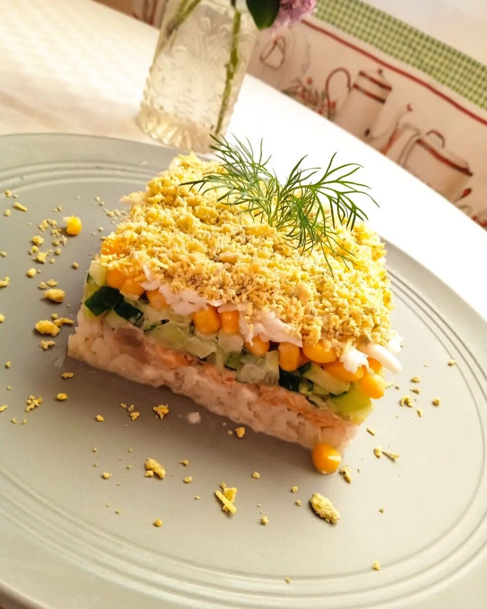 Этот слоёный салатик очень красивый, его можно порционно подавать на праздничный стол, а можно и просто приготовить на ужин-он заменит основное блюдо, так как очень сытный: в нём есть рис, рыбка, яйцо и овощи. Для приготовления салата нам потребуется форма (квадратная или круглая). А приготовить его очень легко: Слои снизу вверх: Рис отварной Горбуша консервированная Огурец свежий Кукуруза консервированная Белок яйца на крупной терке Желток яйца на мелкой терке Слои я смазывала сметаной, можно заменить на греческий йогурт, вкус не убудет 😉 Ну, или, кто любит, можно использовать майонез. Выглядит салатик очень аппетитно, сын заценил😄 #салат #салатсгорбушей #слоеныйсалат #вкусноипросто #простыерецепты #приветобед